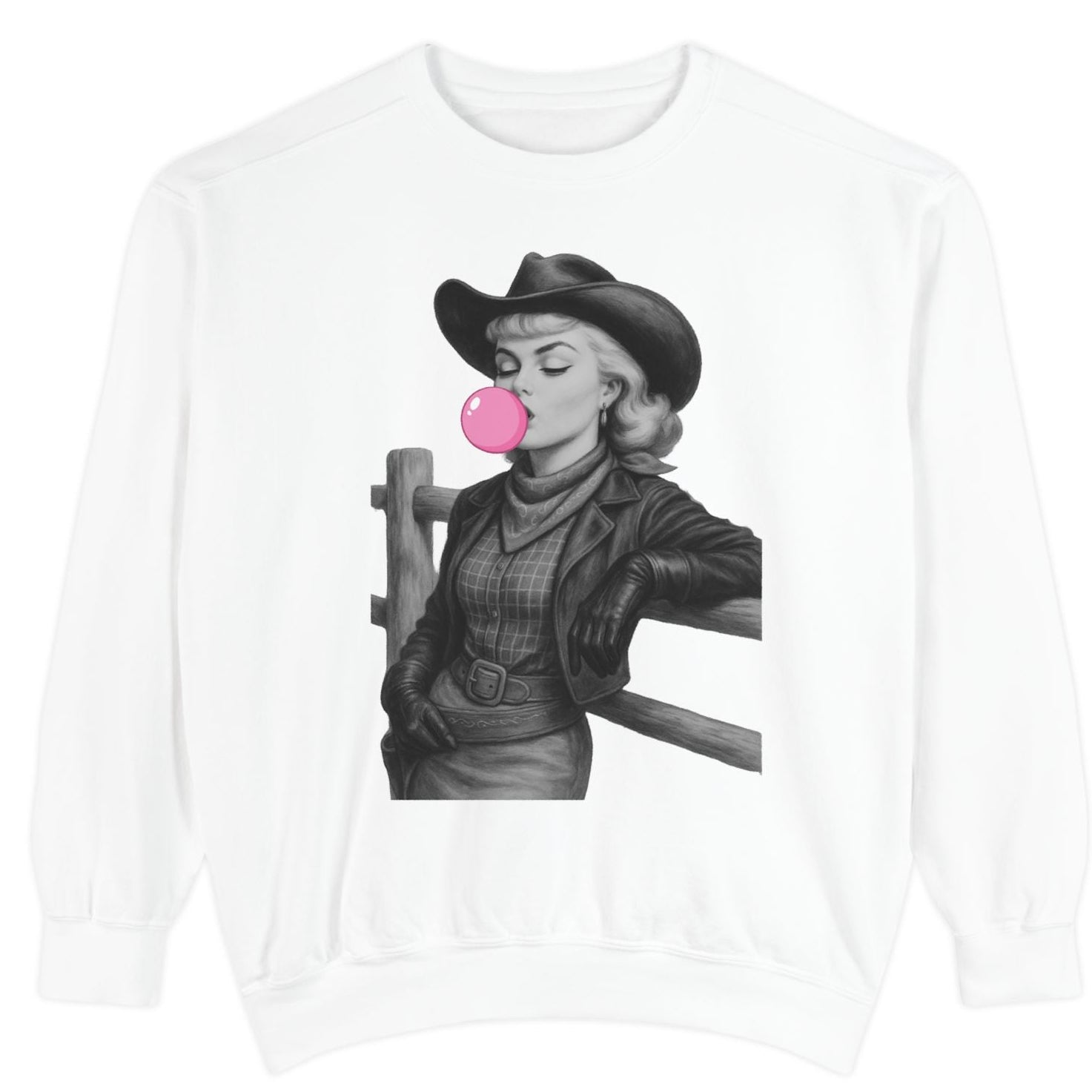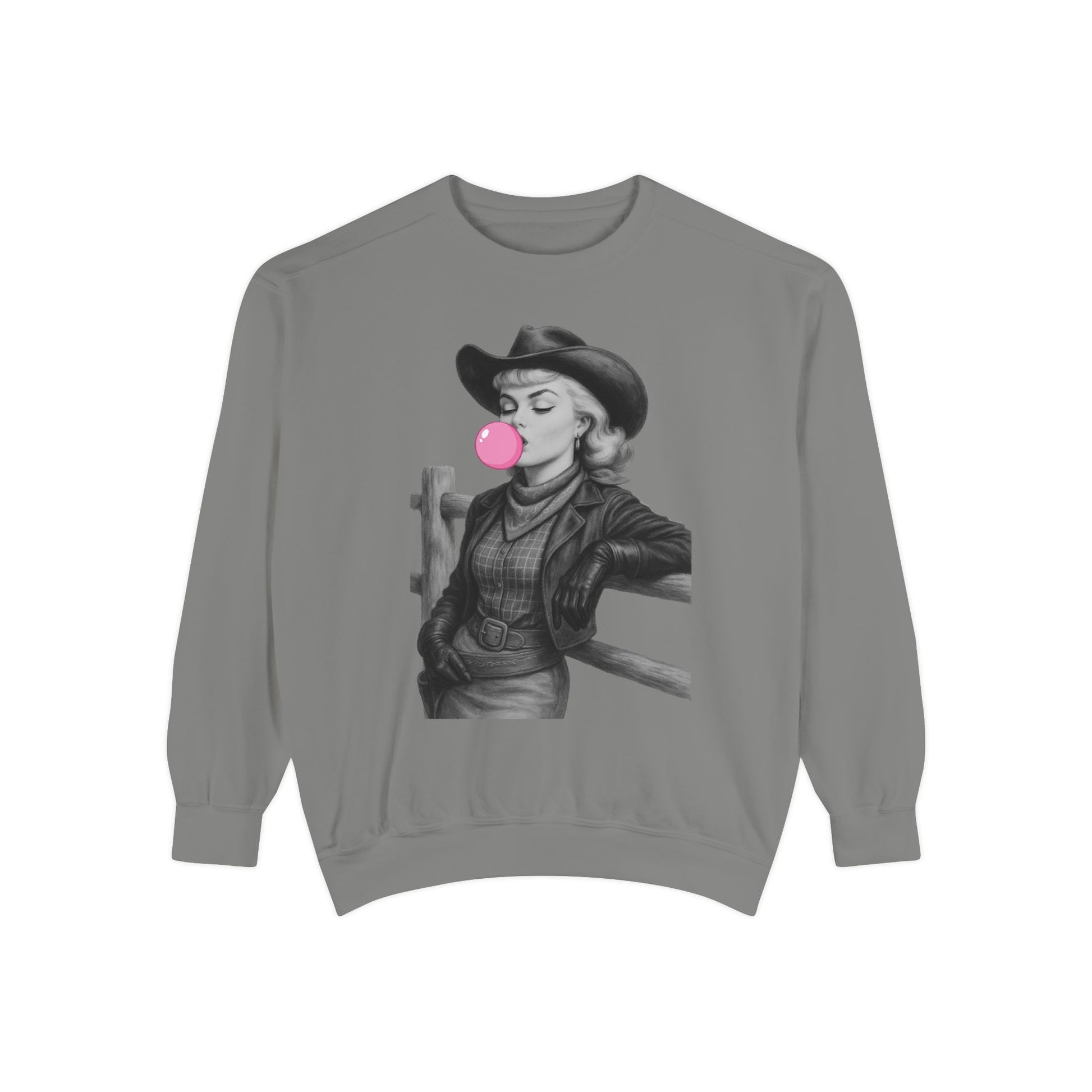 Soft, relaxed, and a little rebellious, this garment-dyed sweatshirt pairs vintage western style with a playful modern twist. The charcoal, detailed illustration of a cowgirl blowing a pink bubble sits bold on the chest, turning a classic crew into a statement layer you’ll reach for when you want comfort with attitude. The midweight fabric and ribbed trims hold shape while the relaxed fit makes it easy to layer over tees or dresses. Wear it to slow mornings at a café, road trips across open highways, or evenings around a backyard fire, it’s the kind of sweatshirt that feels like your own story in the making.