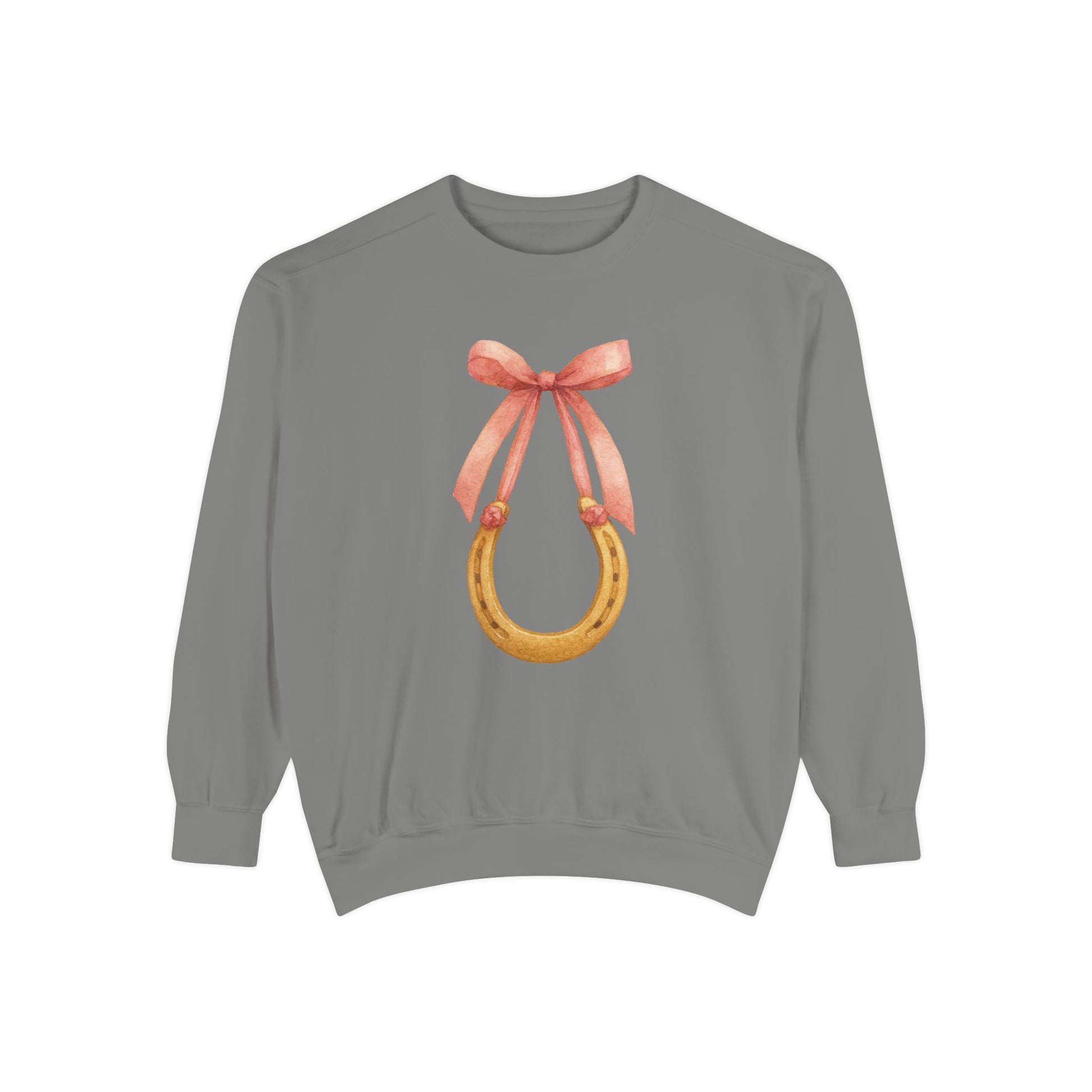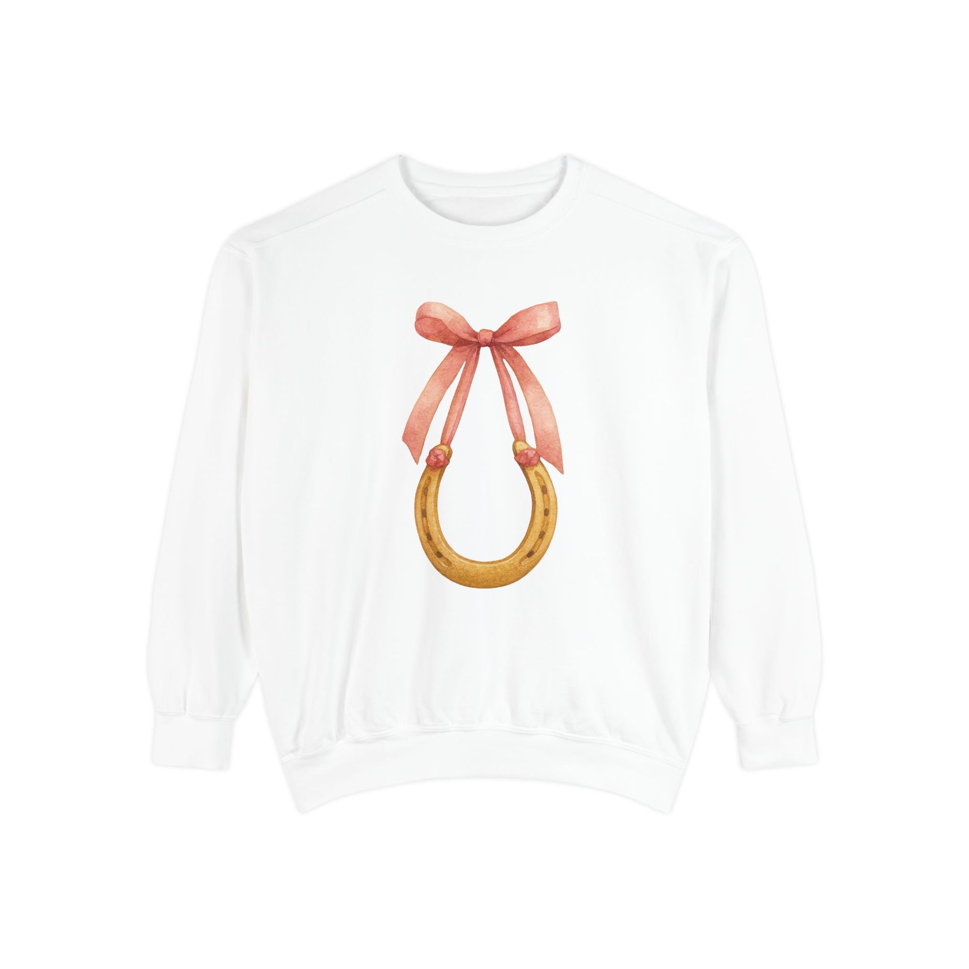Soft, cozy, and quietly charming, this garment-dyed sweatshirt pairs a relaxed silhouette with a delicate watercolor-style motif: a golden horseshoe tied with a faded pink ribbon. It feels lived-in from the first wear, warming the shoulders on crisp mornings and pairing easily with jeans or lounging layers. For anyone who loves low-key equestrian touches, vintage-inspired palettes, or easy weekend outfits, this sweatshirt settles into the rotation and becomes one you reach for again and again.