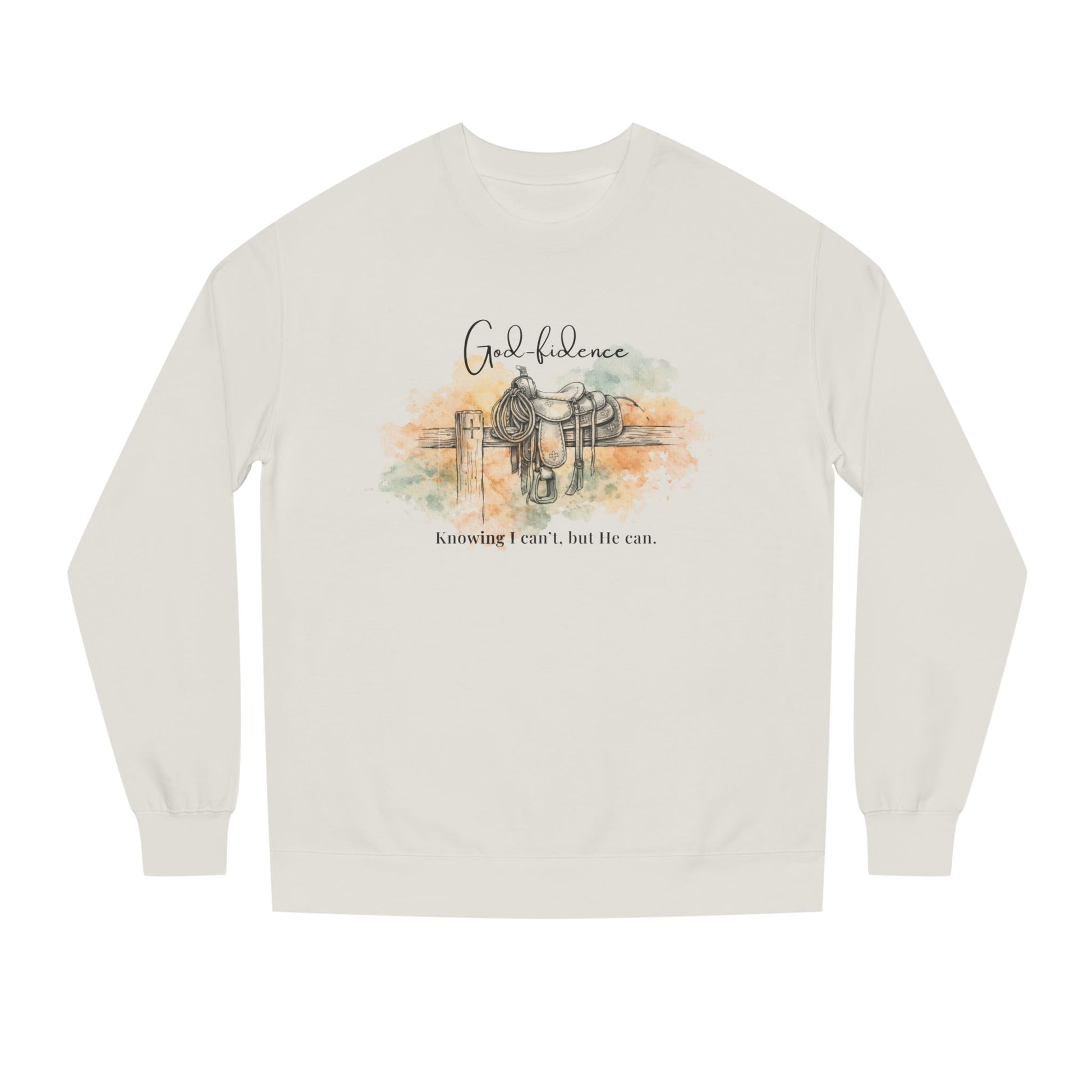 Soft, quietly sentimental crewneck sweatshirt featuring a watercolor-style scene of a saddle on a fence with the phrase “God-fidence” and a small, thoughtful line beneath. The muted palette and hand-painted textures give it a lived-in, countryside feel, like a warm morning on a backroad or a slow afternoon at the family ranch. Lightweight but substantial fleece and a relaxed regular fit make it an easy layer for walks, coffee runs, or evenings by the fire. It settles into your rotation without shouting, bringing a calm, nostalgic note to everyday wear.