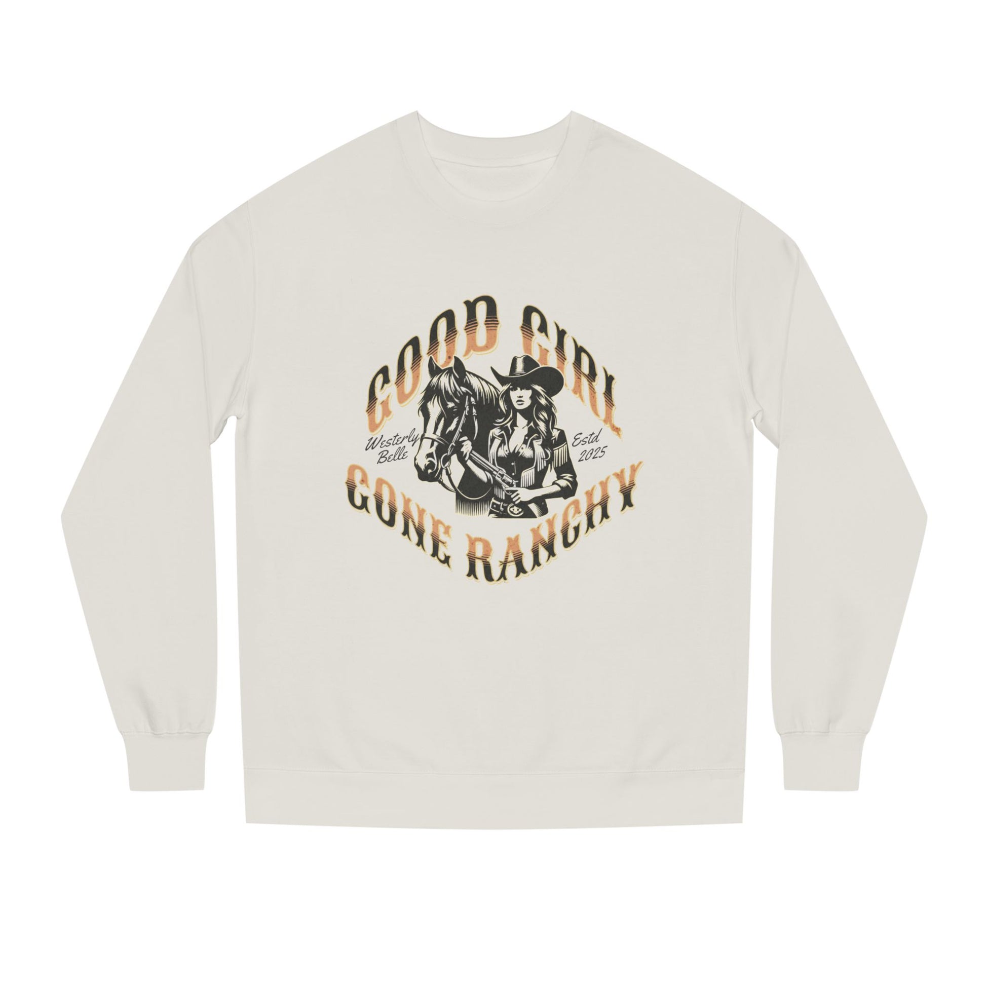 A lived-in, wide-open-feel sweatshirt that channels late-afternoon sunsets and dusty backroads. The front features a vintage-inspired graphic and the phrase “Good Girl Gone Ranchy” in warm, sun-faded tones. Soft but substantial midweight fleece keeps you cozy while the relaxed crew neck and ribbed cuffs let you move freely, whether you’re stacking hay, loading the truck, or lingering at the bonfire. This sweatshirt layers easily over flannels and tees, adding a weathered, adventurous note to any outfit. It’s for people who prefer grit to gloss and who want clothing that tells a story of open land and slow evenings.