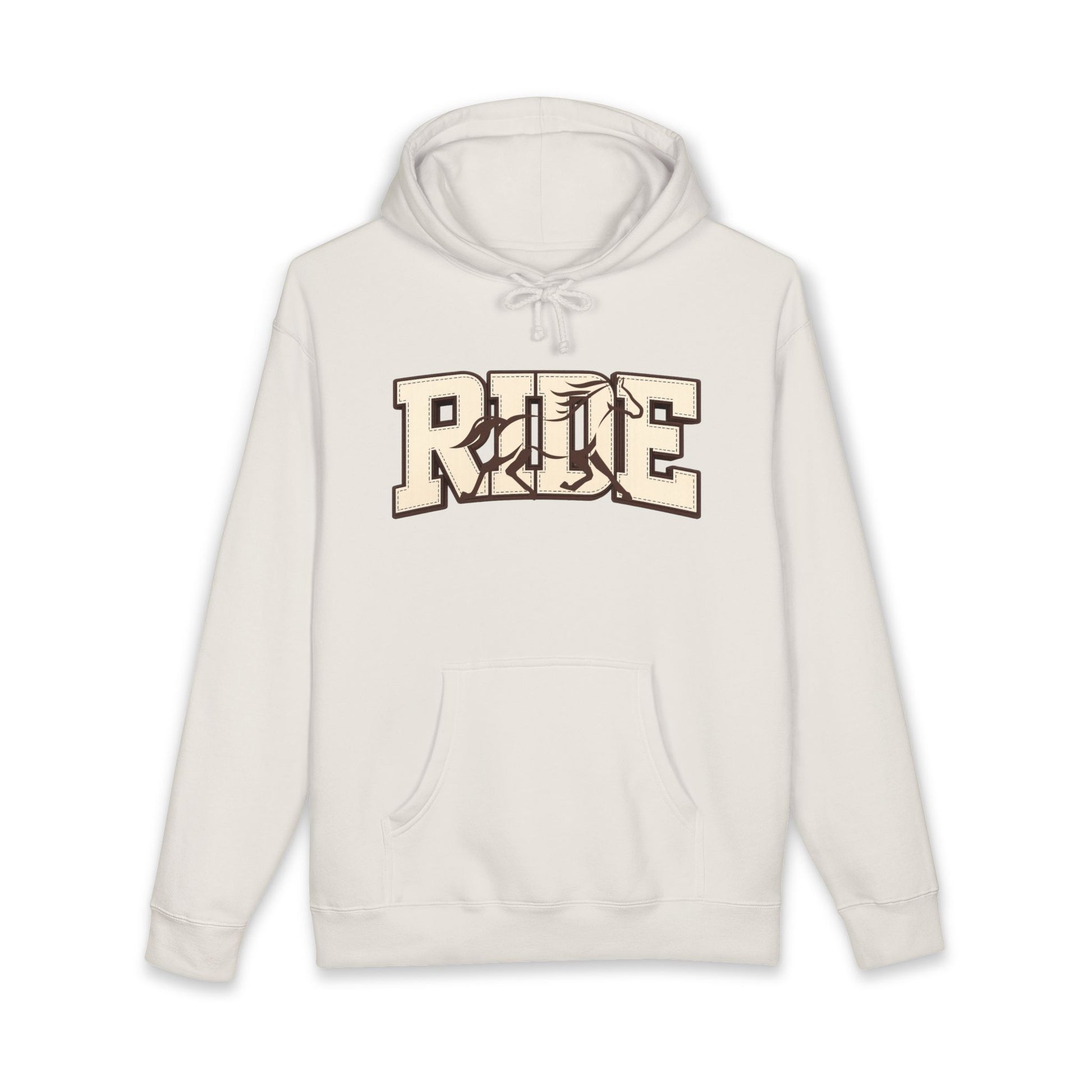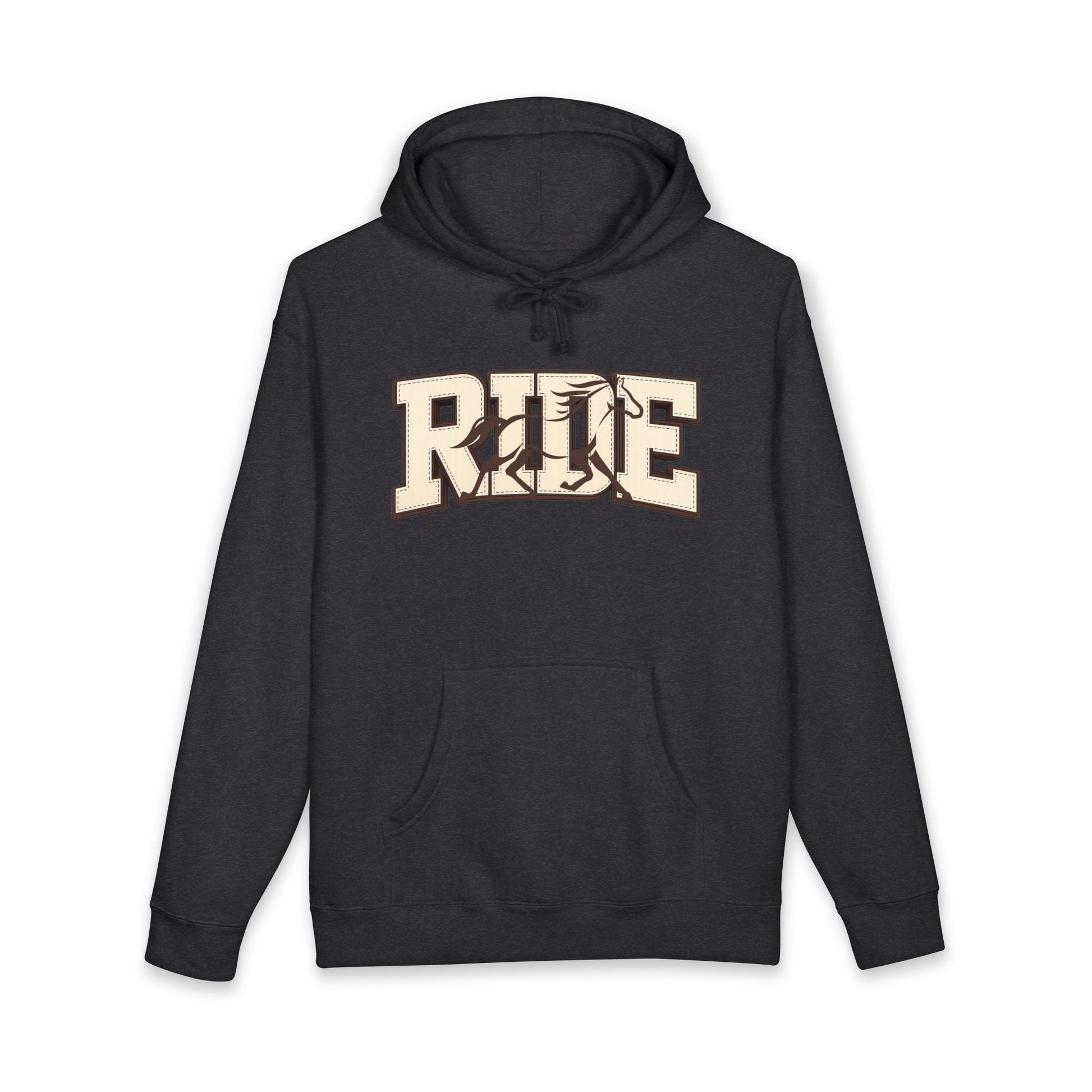 This hooded sweatshirt carries a quiet, steady energy, the word “Ride” shaped with a horse in motion inside the letters, like momentum stitched into fabric. It feels lived-in from the first wear: warm fleece at the hood, a roomy cut for layering, and heavy-weight construction that holds its shape. Throw it on for cool mornings at the barn, for an evening trail ride, or when you want a piece that reads equestrian without shouting. The color options give it a rugged, field-ready look while the soft cotton-blend keeps it comfortable during long days. It’s the kind of hoodie that settles into your rotation and becomes part of the routine: reins in hand, horizon ahead.