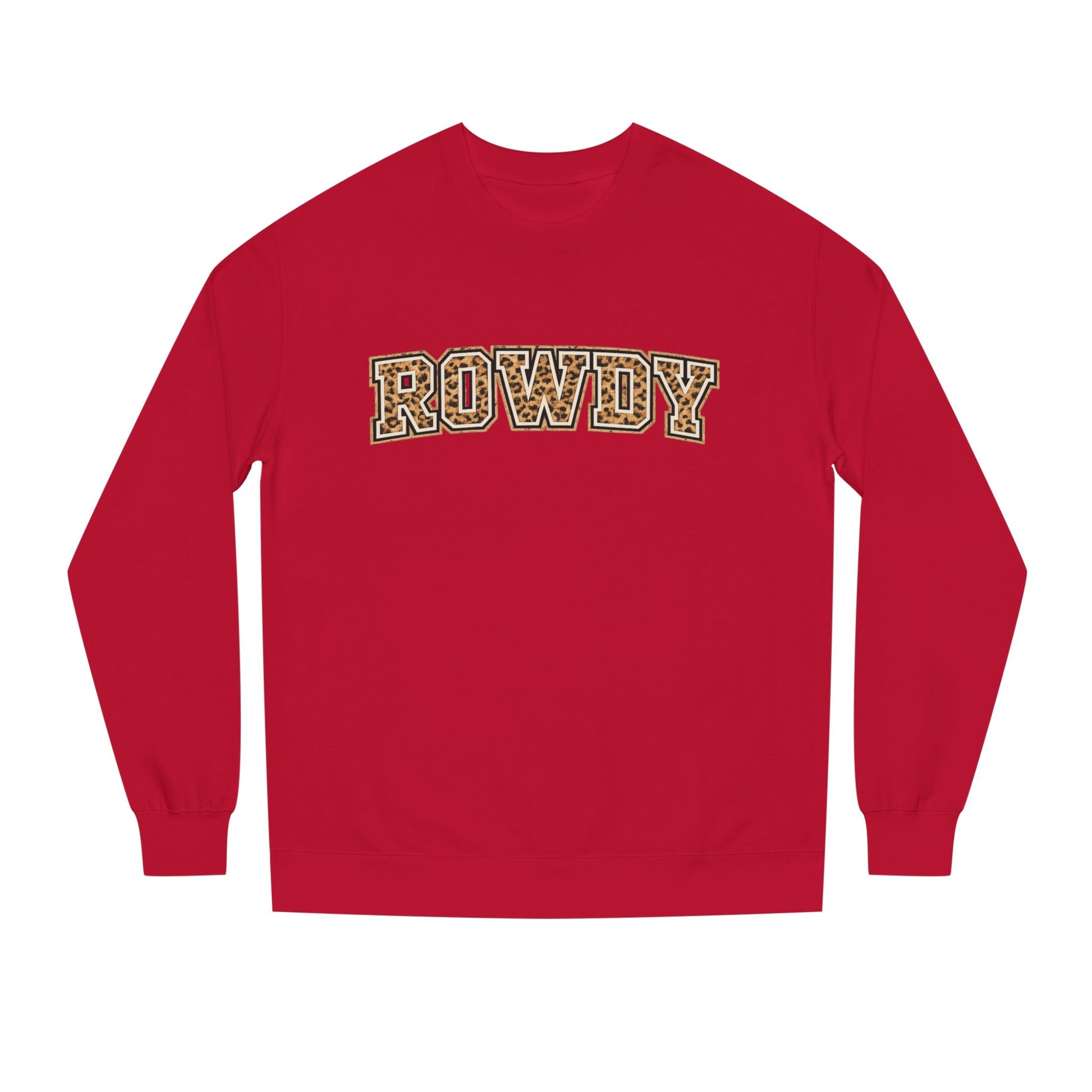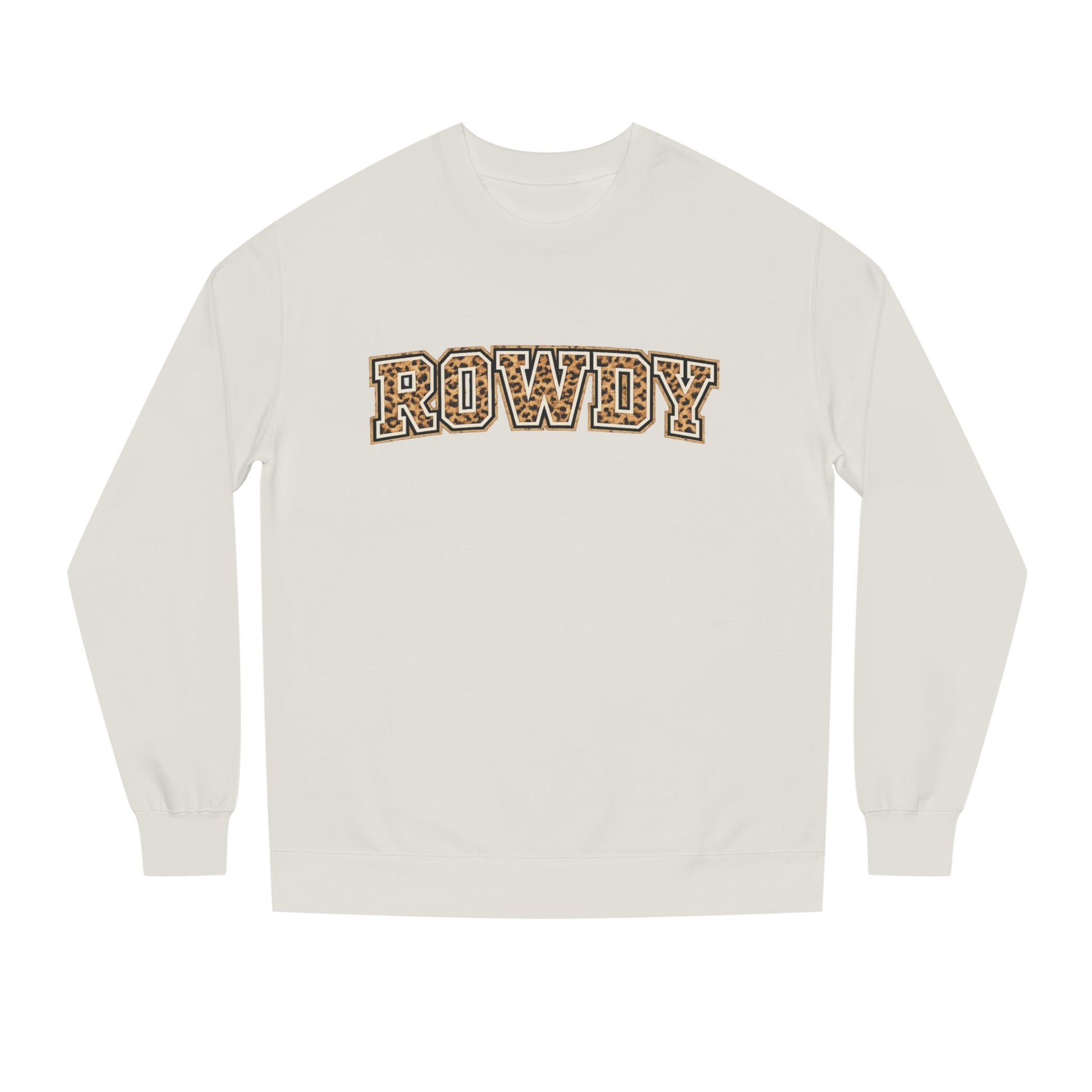 A soft, midweight crew neck sweatshirt with a bold leopard-print 'ROWDY' across the chest. The slightly structured fit and ribbed collar, cuffs, and hem keep shape while layering over tees or under jackets. It reads confident, playful, and a little bit wild. Wear it for weekend coffee runs, late-night bonfires, or when you want to toss on something comfortable that still says you’re in charge of the vibe.
