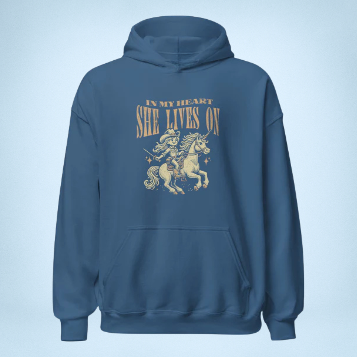 A tender tribute wrapped in western whimsy. This design blends nostalgia and magic, featuring a cowgirl riding a unicorn like a memory that refuses to fade. Sweet, sentimental, and full of heart.