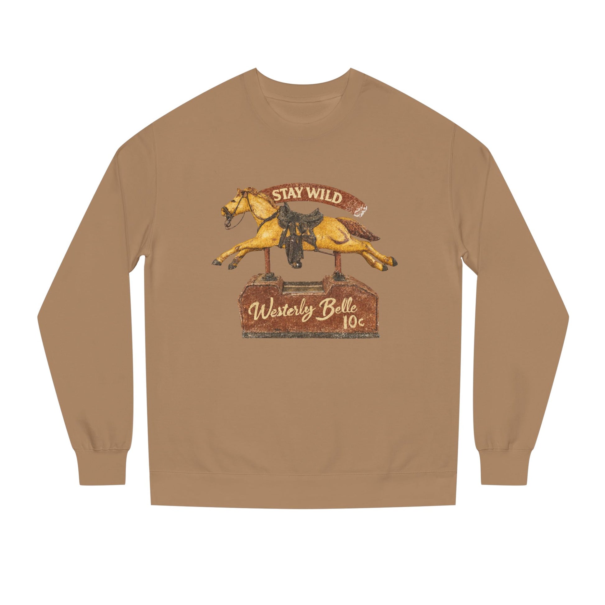 Slip into a sweatshirt that feels like a breezy afternoon at the fairgrounds. This crew neck sweatshirt carries a hand-painted horse ride graphic, worn leather saddle, golden mane, and a faded wooden sign reading “Stay Wild” and “Westerly Belle 10¢.” It reads like nostalgia: long summer rides, dusty barns, and the unmistakable creak of an old merry-go-round. The medium-heavy fleece gives comforting weight without bulk, and the tear-away label means nothing scratches or tags at your neck. The regular fit and ribbed collar, cuffs and hem keep the silhouette classic while the reinforced necktape and double-needle seams mean it ages like your favorite vintage find. For folks who collect worn-in style and stories, this piece feels lived-in from the first wear.