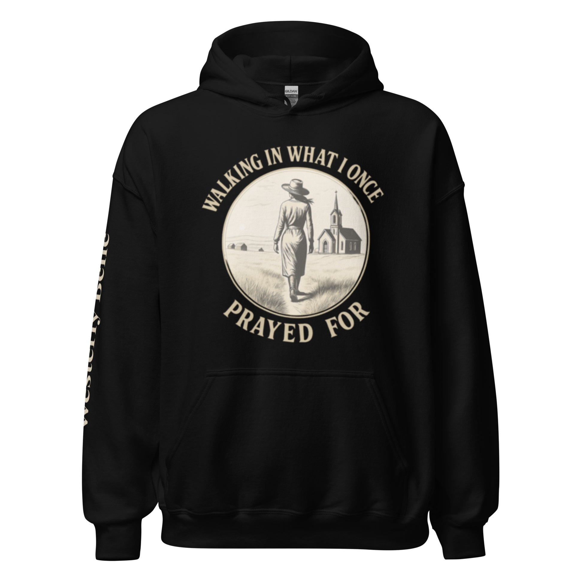 A reminder that the life you dreamed of is the one you’re standing in. This heavyweight oversized hoodie features a vintage-inspired back graphic of a woman walking toward a small-town church at golden hour — framed by the words that speak for themselves: Walking in what I once prayed for. Made for the ones who’ve weathered the storms, kept the faith, and now wear their answered prayers with quiet pride.