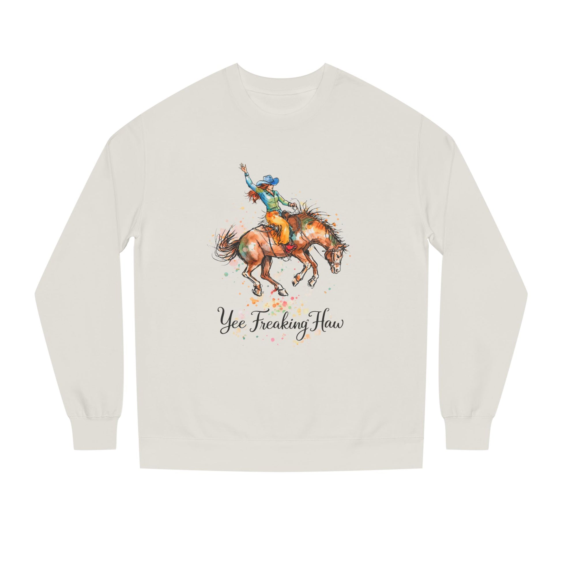 This cozy crew neck sweatshirt brings a playful, western attitude to quiet mornings and noisy rodeos alike. A watercolor-style bronco and cowboy burst across the chest, mid-buck, with hand-lettered words beneath that read “Yee Freaking Haw.” The soft, slightly brushed face and medium-heavy weight give a warm, lived-in feel, great for layering over a plaid shirt or wearing solo on cool evenings by the fire. It sits at a comfortable regular fit with ribbed cuffs and hem that stretch with you and snap back into shape. Built to stand up to frequent wear, the double-stitched seams and reinforced neck tape keep it holding its shape season after season.